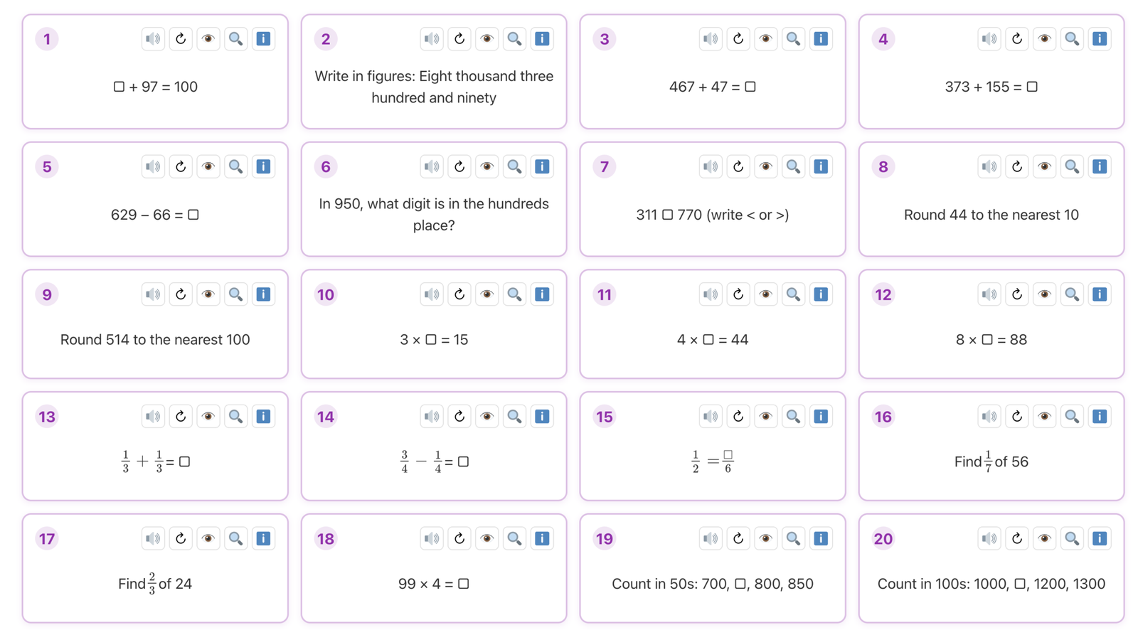 Plenty of numeracy practice in 20 questions. A free collection of interactive maths practice pages covering Year 1 through to GCSE, focusing on the essential number skills students need for mathematical success.