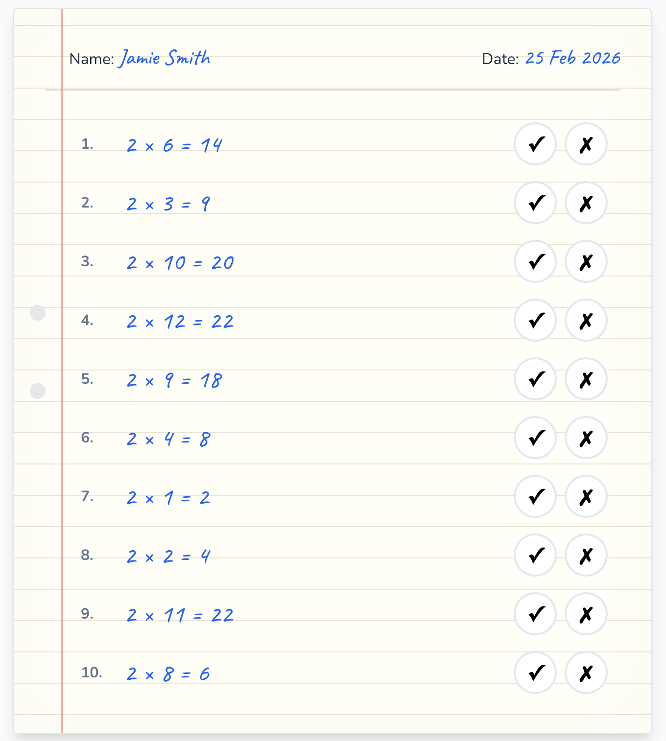 Play the role of the teacher, marking a times table quiz. Which answers are correct and which are wrong?